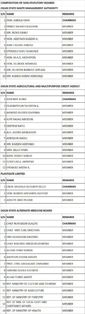 The appointments cover the Ogun Waste Management Authority (OGWAMA), Ogun State Agricultural and Multipurpose Credit Agency (OSAMCA), Plantgate Limited and the Ogun State Alternative Medicine Board (OGAMB).